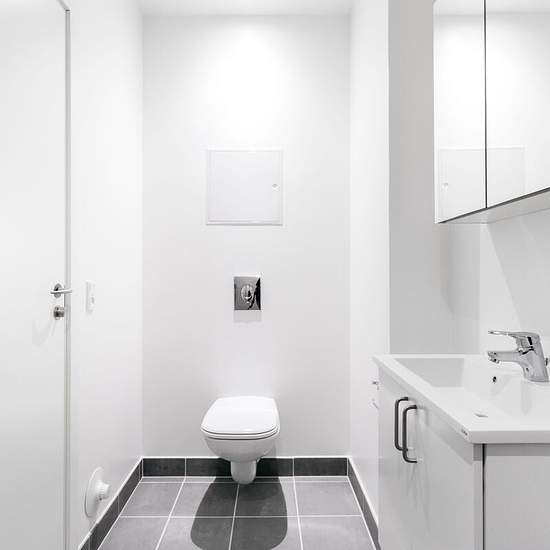 Alle lejligheder er beliggende på bygningens første sal ovenpå en stor og velassorteret Meny. Alle lejligheder er 1-værelseslejligheder med kombineret stue- og køkkenområde og eget badeværelse. Der er depotrum i bygningens kælder. Hårde hvidevarer Der er køleskab og fryser samt kogeplade i boligen. Vaskemaskine og tørretumbler findes i det fælles vaskerum. Husdyr Lejere kan ansøge om tilladelse til at holde én indekat på adressen. Udekatte og hund er ikke tilladt. Se vores samlede husdyrsregler her. Parkering Der er ikke parkering tilknyt...