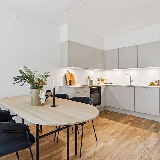 Om lejlighederne: Alle lejligheder er udstyret med altan eller terrasse og boligerne er indrettet i smagfulde materialer. Generelt er der lagt vægt på rummelige leverum indrettet med Invitakøkkener i moderne og stilrene designs, egetræsgulve og flot lysindfald fra de store vinduespartier. I alle lejligheder, er der etableret gulvvarme, herunder også i badeværelset, som er udstyret med energivenlig vaskemaskine og tørretumbler. I lejlighederne er der lagt vægt på gode opbevaringsløsninger i form af skabe og alle lejligheder har adgang til pri...