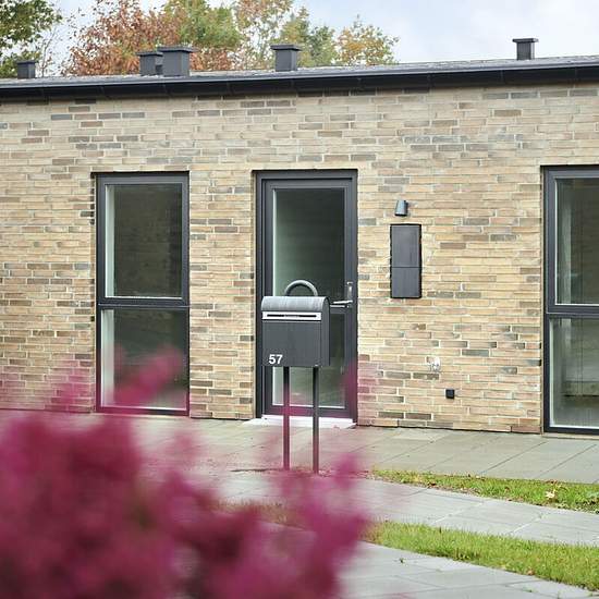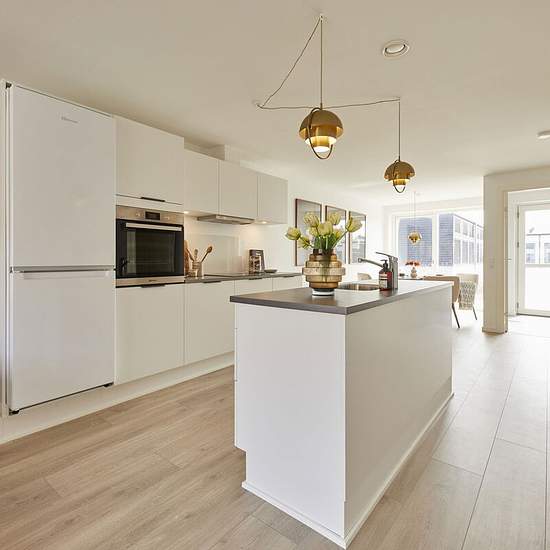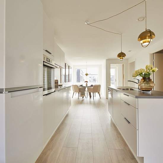 Rækkehus indrettet med særskilt entre med direkte adgang til stort køkkenalrum og stue i ét. Her er store glaspartier i begge ender af rummet, hvilket giver en gennemstrømning af naturligt lys. I midten af rummet er placeret det moderne og lyse køkken, hvor der på begge sider heraf er god plads til spisebord samt hyggelig stue. Fra køkkenalrum er videre adgang til stort soveværelse med skabsvæg, værelse, særskilt bryggers samt badeværelse. Have: Egen have og terrasse Udhuse: Redskabsrum 7m² Parkering: Fælles parkering Al forbrug afregnes di...