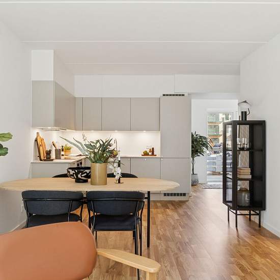 Om lejlighederne: Alle lejligheder er udstyret med altan eller terrasse og boligerne er indrettet i smagfulde materialer. Generelt er der lagt vægt på rummelige leverum indrettet med Invitakøkkener i moderne og stilrene designs, egetræsgulve og flot lysindfald fra de store vinduespartier. I alle lejligheder, er der etableret gulvvarme, herunder også i badeværelset, som er udstyret med energivenlig vaskemaskine og tørretumbler. I lejlighederne er der lagt vægt på gode opbevaringsløsninger i form af skabe og alle lejligheder har adgang til pri...