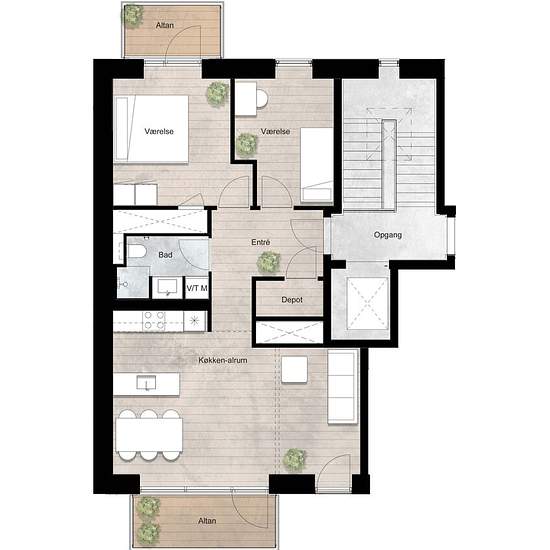 Nærværende lejemål er beliggende i Musicon, som er Roskildes kreative bydel. Musicon er et tidligere industriområde, som søjlepladsen og de store haller er et flot bevis på. Gulvet i lejemålet er 3 stavs egeparket, de hårde hvidevarer er fra GRAM (emhætte fra Thermex), armaturer er fra henholdsvis Grohe, HansGrohe og køkkenet/skabene er fra INVITA.