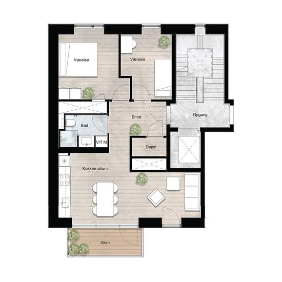Nærværende lejemål er beliggende i Musicon, som er Roskildes kreative bydel. Musicon er et tidligere industriområde, som søjlepladsen og de store haller er et flot bevis på. Gulvet i lejemålet er 3 stavs egeparket, de hårde hvidevarer er fra GRAM (emhætte fra Thermex), armaturer er fra henholdsvis Grohe, HansGrohe og køkkenet/skabene er fra INVITA.