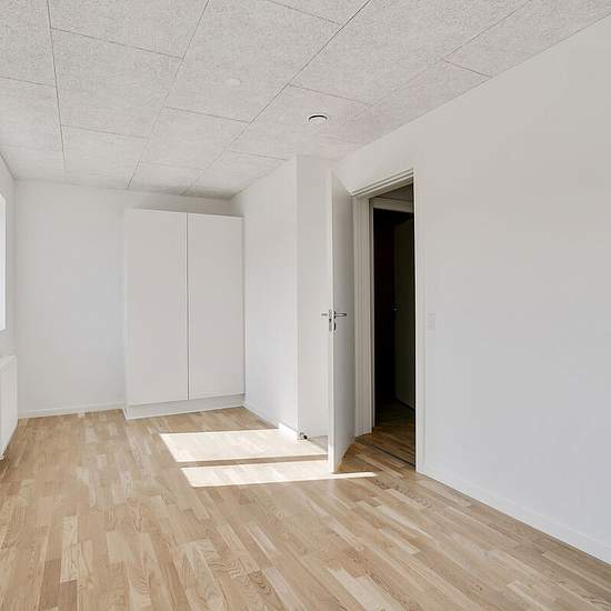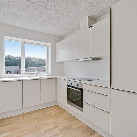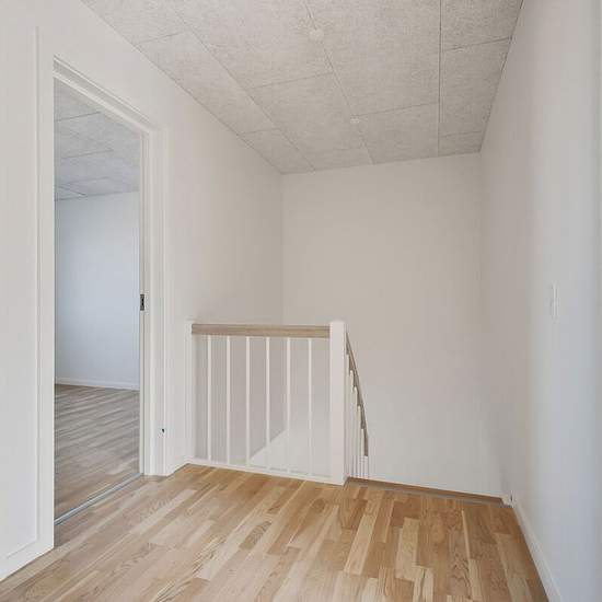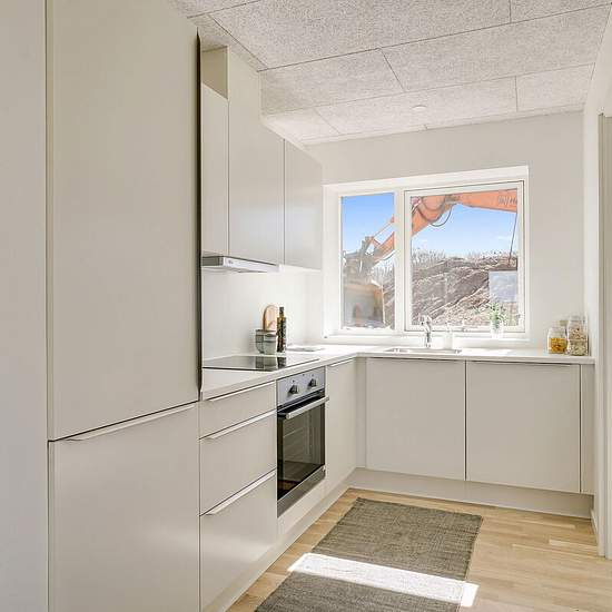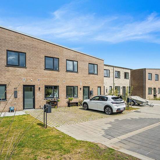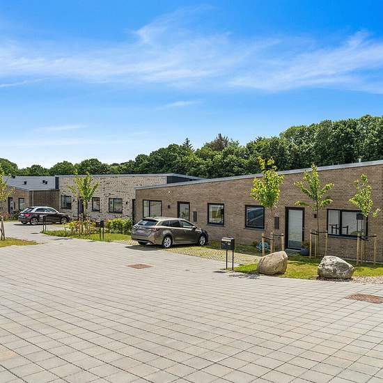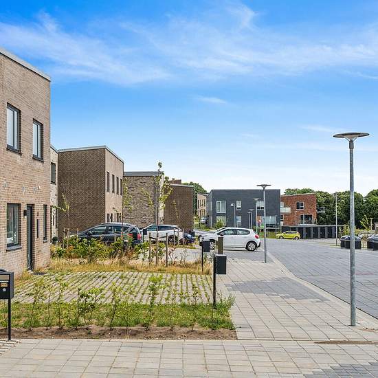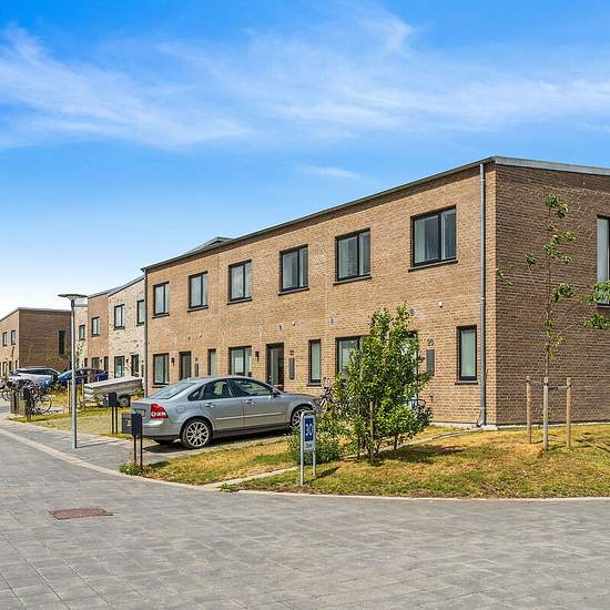 I ét-plans rækkehusene får du en entré, hvorfra der er adgang til to af boligens tre separate værelser. Du får et stort køkken-alrum i åben forbindelse med stue. Fra stuen er der adgang til boligens største værelse og badeværelset. I to-plans rækkehusene får du ligeledes en entré i stueplan samt toilet og det store køkken-alrum i åben forbindelse med stue. På førstesalen finder du tre separate værelser samt badeværelse. Der er gulvvarme i stueplan og på begge badeværelser. Alle rækkehuse har egen have samt flisebelagt terrasseområde. Hår...