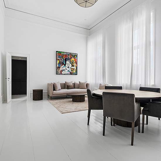 Unik lejlighed på Gurrehus Slot - Fuldt møbleret. Lejligheden er beliggende i stueplanen på Gurrehus slot og er én ud af seks lejligheder på slottet. Lejligheden er karakteriseret ved en imponerende loftshøjde, flot lysindfald af de høje vinduespartier og fremstår luksuriøst møbleret - Lige til at flytte ind i. Man ankommer direkte i lejlighedens stuerum, hvor der er indrettet garderobe. Her oplever man med det samme det flotte lysindfald og den imponerende loftshøjde på over fire meter. Stuerummet er indrettet som køkken alrum med både spis...