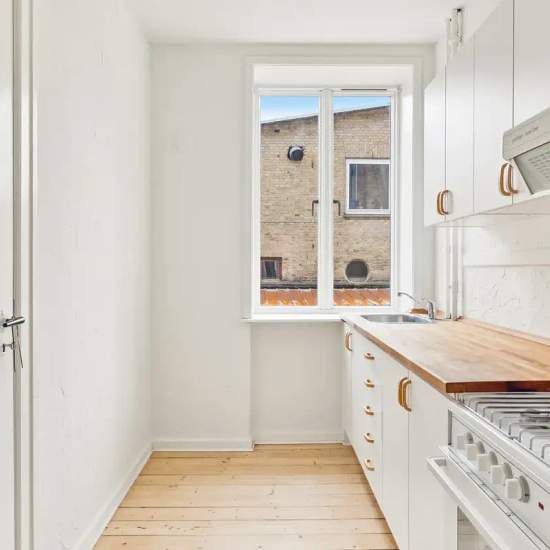 Denne lejlighed er beliggende i et eftertragtet område. Lejligheden er i kort afstand til offentlig transport, indkøbsmuligheder og grønne områder, hvilket gør den ideel for både singler og par, der ønsker en hverdag med nem adgang til byens faciliteter. Her får du en oase af velvære med byens puls kun et stenkast væk. Lejligheden byder på en rummelig lys stue med stuk og smukke dannebrogsvinduer. Her er der plads til både spisebords- og sofaarrangement. Køkkenet har lyse skabselementer og overskabe, som giver ekstra opbevaringsplads. Sov...