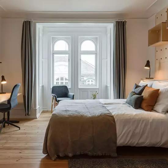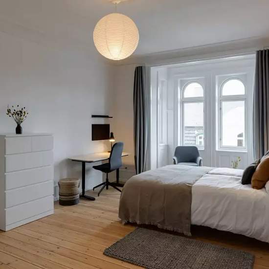 On the 17th of October, our brand new coliving home Mynster will open it's doors! This fully renovated apartment has has a modern kitchen with dining area, a brightly lid living room with cozy couches, 3 beautiful single bedrooms and 2 couples rooms (1 with ensuite bathroom). There is 1 big shared bathroom with laundry facilities and an extra guest toilet. The apartment is on the 4th floor overlooking both the Mynstervej and the Gammel Kongvej, where you can find a lot of interesting shops and restaurants. The supermarket is right downstairs...