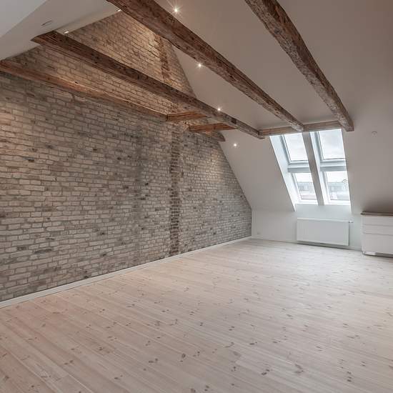 Helt nyetableret taglejlighed på Boulevarden med nyt plankegulv, ovenlysvinduer, synlige bjælker med loft til kip i stue og spisestue. Køkken med alt i hårdehvidevarer også opvaskemaskine. Værelse med indbyggede skabe og stort badeværelse med egen vaskemaskine og tørretumbler, derudover indbyggede skabe i gang også. Derudover stor hems. Lejemålet indeholder: • 82 m2, derudover stor hems med 180cm til loft i midten. • Stue og spisestue med fritliggende bjælker og ovenlysvinduer. • Soveværelse med indbyggede skabe. • Køkken med alt i hårdehv...