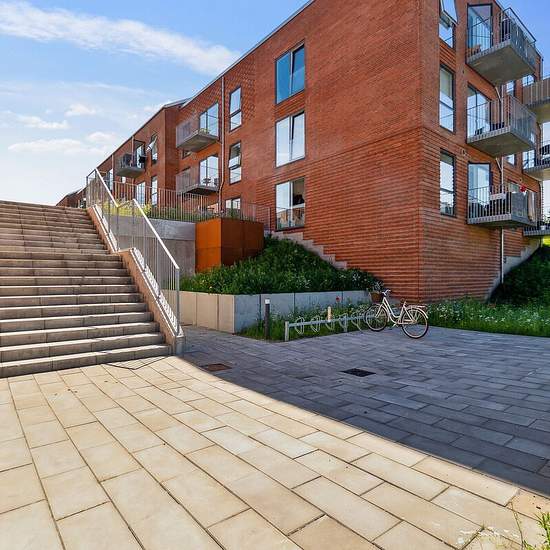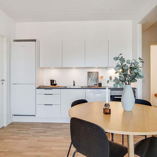 Alle lejligheder har et køkken-alrum i åben forbindelse med stue. I de ét-værelses lejligheder fungerer køkken-alrummet ligeledes som soveværelse. Ellers har du ét eller to separate værelser. Badeværelset er velindrettet med vaskefaciliteter og gulvvarme. Alle lejemål har egen terrasse eller altan. Hårde hvidevarer Boligerne har alt i hårde hvidevarer inklusive vaskemaskine, tørretumbler og opvaskemaskine. Husdyr Lejere kan ansøge om tilladelse til at holde indekat og hund på adressen. Udekatte er ikke tilladt. Se vores samlede husdyrsreg...