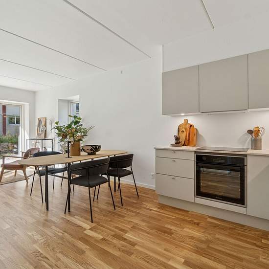 About the apartments: All apartments are equipped with a balcony or terrace and are finished with tasteful materials. In general, emphasis has been placed on spacious living areas fitted with Invita kitchens in modern, sleek designs, oak floors and beautiful natural light from the large windows. All apartments have underfloor heating, including in the bathroom, which is equipped with an energy-efficient washing machine and tumble dryer. The apartments also focus on good storage solutions in the form of cupboards, and every apartment has acce...