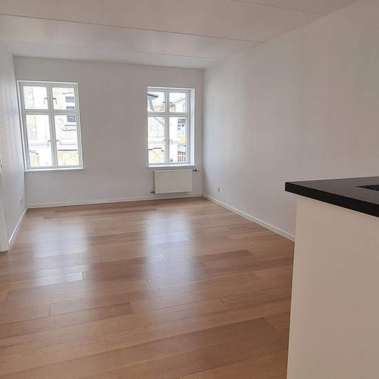 Beautiful apartment located on Skolegade. The apartment consists of an entrance hall, a lovely bathroom with black granite and underfloor heating, an open kitchen/living room with a granite countertop, and a bedroom with built-in wardrobes. The building has an elevator and a large communal terrace, offering a nice opportunity to create your own private area connected to the apartment, and there is installed cable TV/broadband. It is possible to rent a parking space in the courtyard. Pets are not allowed. Contact us to request a viewing by ph...
