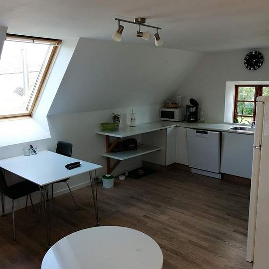 Bright and spacious apartment located in scenic surroundings on a country property. The apartment has a very charming and interesting layout – entrance hall, shower bathroom, large eat-in kitchen open to the living room, bedroom, and two rooms accessible via their own staircase. The property includes good outdoor areas with space for everyone. A property with only quiet residents. Note that a/c consumption covers water, heating and electricity. The apartment is located on the first floor. EMAIL