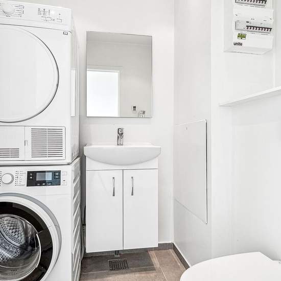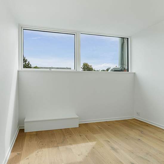 Lys og moderne lejlighed i to plan med et dejligt lysindfald fra de store vinduespartier. Stueetagen er indrettet med et elegant, hvidt køkken med grebsfri fronter og kvalitetshvidevarer, et toilet med vaskesøjle samt en rummelig stue med plads til både sofagruppe og spisebord og med udgang til en stor, sydvestvendt terrasse. Førstesalen er indrettet med repos, to gode soveværelser samt et flot badeværelse med brus. Til boligen hører depotrum i kælderen. Have: Terrasse Udhuse: Depotrum i kælder Parkering: Fælles parkering Aconto vand/spildev...