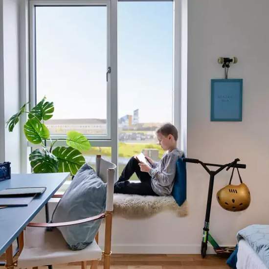 The apartment 3-room well-lit family apartment. Lovely large living room with access to a south-facing balcony suitable for furnishing. Connected to the living room is a modern white Invita kitchen with plenty of cupboard space and appliances from Gram, including a dishwasher. Bedroom with built-in wardrobes. One children's room with plenty of space. Spacious and inviting bathroom with tiles on the floor and in the shower area, as well as underfloor heating. Molded sink, wall-hung toilet and a washer-dryer column. Beautiful oak strip-parquet...