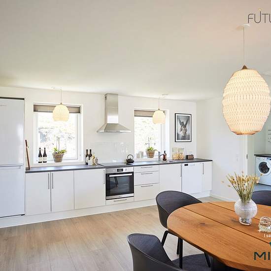 På Hørvænget finder du dette moderne rækkehus, hvor alt er tænkt ind i en rolig og funktionel hverdag. Her får du 95 veludnyttede kvadratmeter, en planløsning uden spildplads og en stemning af nybyggeri – men tilført varme, lys og en naturlig rummelighed, der gør det let at føle sig hjemme fra det øjeblik, du træder ind. Et lyst og imødekommende opholdsrum Boligens hjerte er det store køkken-alrum i åben forbindelse med stuen. Vinduer fra gulv til loft giver et smukt og naturligt lysindfald, og de lyse laminat egeplankgulve binder rummene ...