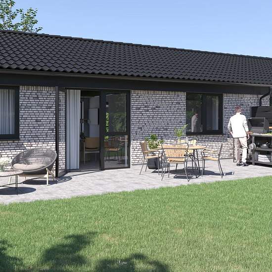 Luft, lys og hverdagskomfort Velindrettet bolig på 85 m², hvor der er tænkt på både funktionalitet og atmosfære. Her får du et moderne hjem med en harmonisk planløsning, masser af dagslys og mulighed for et udeliv, der bliver en naturlig forlængelse af boligen. Boligen Det store køkken/alrum og stue danner boligens naturlige samlingspunkt. Her er god plads til både madlavning, samvær og afslapning, og de store vinduespartier giver et flot lysindfald og direkte adgang til terrassen. Boligen rummer to gode værelser – et rummeligt soveværels...
