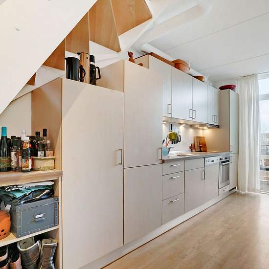Ground floor features an open kitchen-living area with all major appliances, including a fridge-freezer, oven, cooktop and dishwasher. The bathroom has underfloor heating and its own washer-dryer stack. On the first floor you’ll find three good bedrooms, two of which have lofts. There is access to a private balcony from the kitchen-living area. In addition, the residence has its own storage room. It is permitted to have a dog or cat by arrangement.