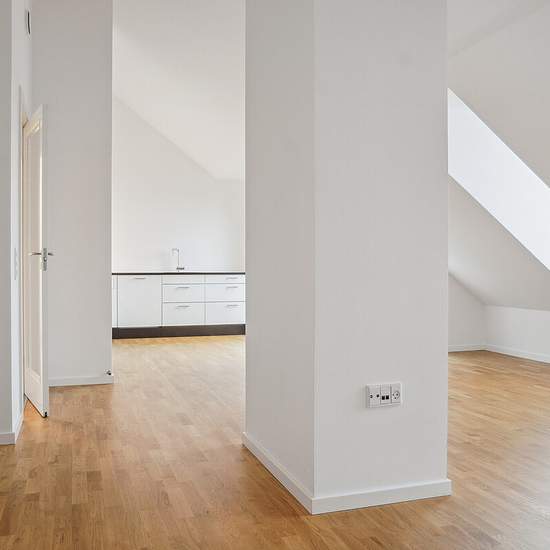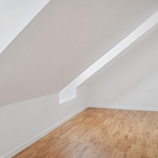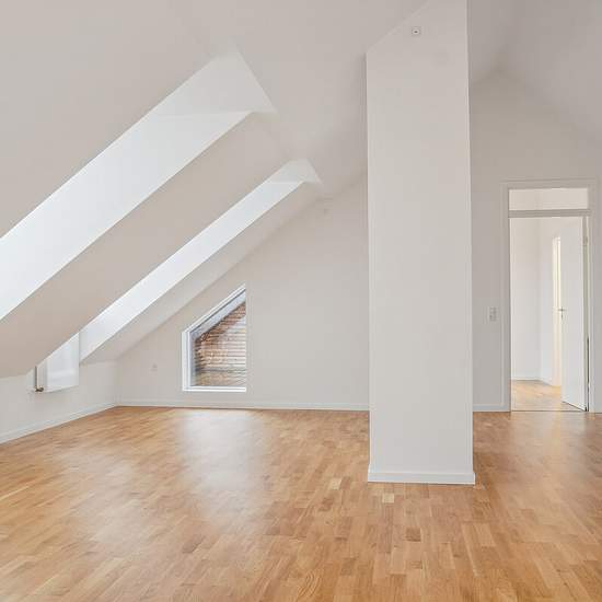 Newly established four-room penthouse apartment with an entrance hall, 2 bathrooms and a roof terrace. The apartment has sloping ceilings and vaulted/high ceilings in all rooms except the entrance hall. One of the apartment’s two bathrooms, in addition to a shower enclosure, is fitted with its own washing machine and dryer. The rooms and bathroom have dormer windows, providing a good sense of space and plenty of natural light in the home. The kitchen and bathrooms are finished in white laminated surfaces. From the kitchen-living room and fro...