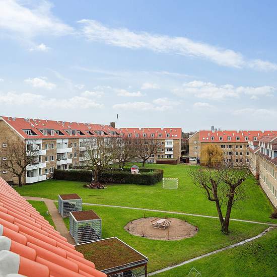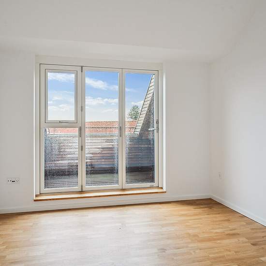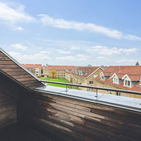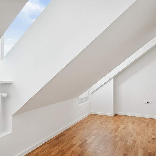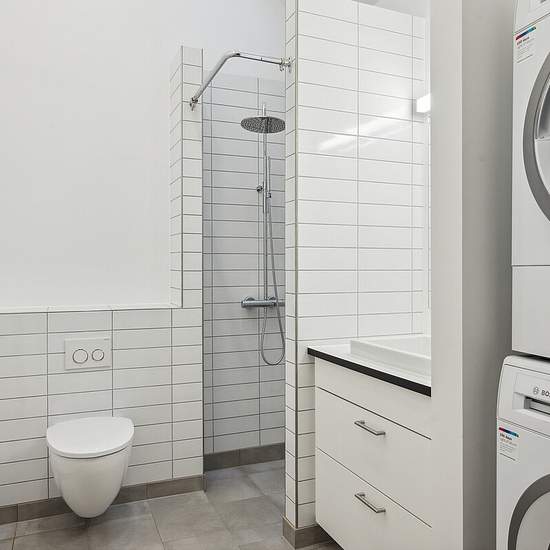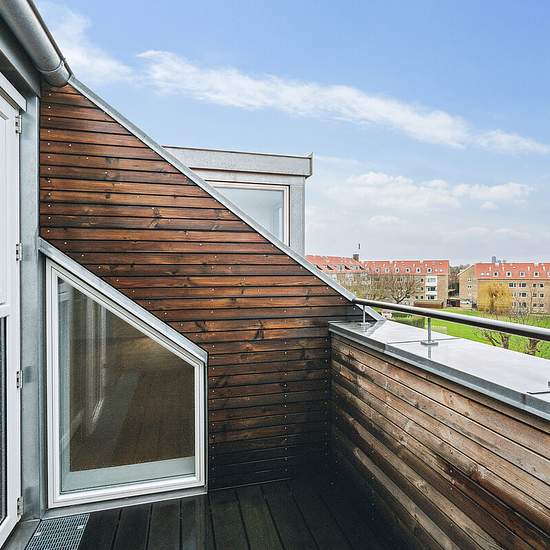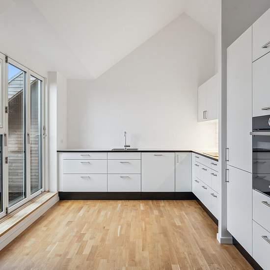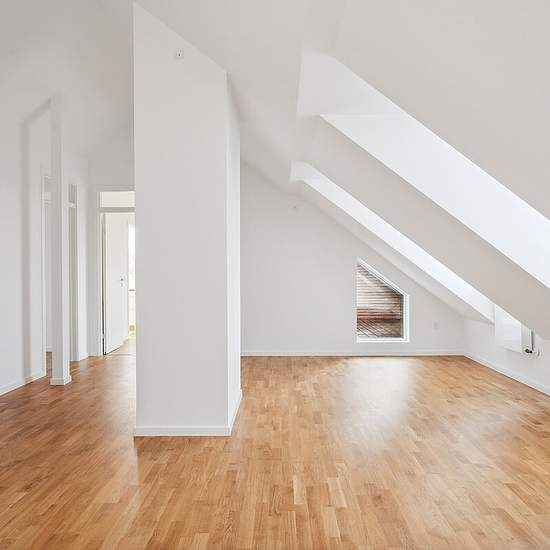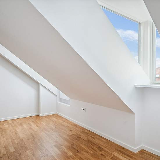 Newly established four-room penthouse apartment with an entrance hall, two bathrooms and a roof terrace. The apartment features sloping, cathedral ceilings in all rooms except the entrance hall. One of the apartment’s two bathrooms, in addition to a shower niche, is equipped with its own washing machine and tumble dryer. The rooms and the bathroom are fitted with dormer windows, which provide a good sense of space and plenty of natural light. The kitchen and bathroom are finished in white laminated surfaces. From the kitchen/living area and ...