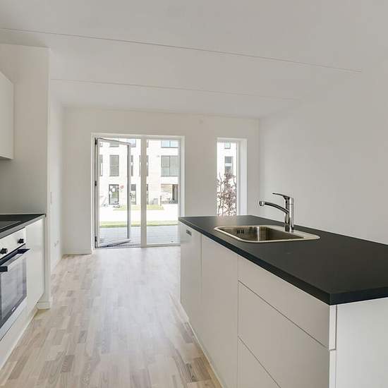 The apartment: Lovely apartment with a large open-plan kitchen and living area with direct access to two large private terraces, one on each side. In addition, the apartment offers a large, spacious bedroom and a modern bathroom with a separate shower. The apartment is bright and only the best materials have been used. Furthermore, there is underfloor heating and a Genvex system which ensures a good indoor climate. The home provides a safe and comfortable setting for the quality-conscious pleasure-seeker. There is also direct access to a sto...