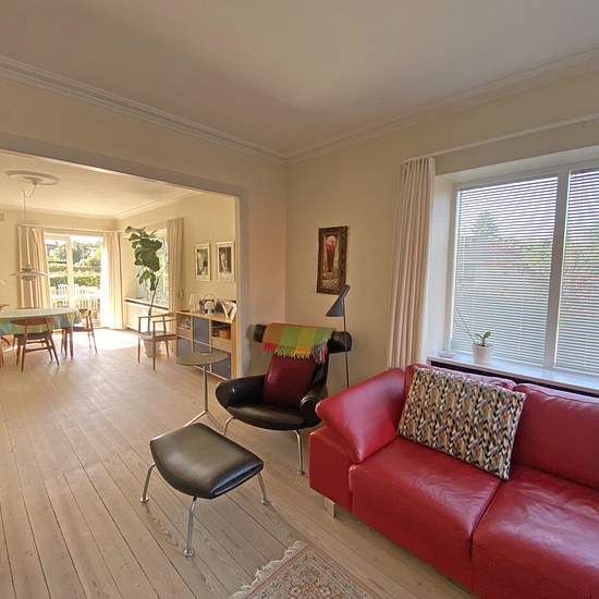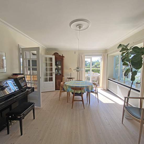 In the picturesque and peaceful Lundtofte in Lyngby you will find this inviting four-level villa with a total of 270 square metres of living space and a spacious basement of 101 m². There is plenty of room for a family that needs lots of space, and the house also offers several sunny terraces, a beautifully planted garden and the possibility of an electric car charging point. The ground floor comprises an entrance with wardrobe, a shower bathroom, a large and bright kitchen-dining area with direct access to a terrace, and two en‑suite living...