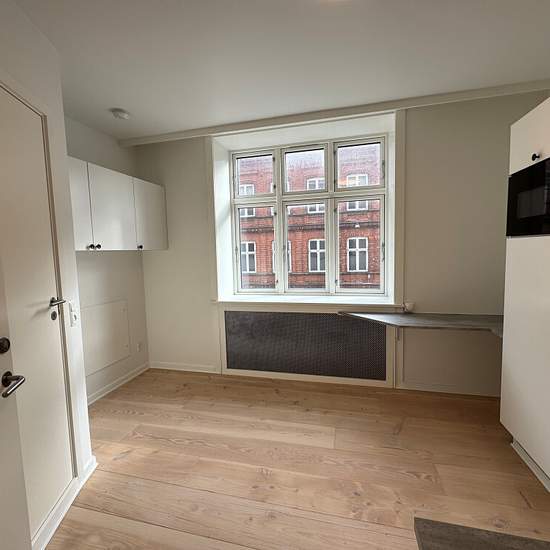 This well-located one-room apartment is situated in the prominent corner building on the square in Esbjerg, where the ground floor houses Matas. Access is from Torvegade via a bright, wide staircase with tiled steps. The apartment is functionally laid out with a built-in dining table adjoining the newer kitchen from 2025. There is also room for a bed or sofa bed with storage cabinets above. The apartment appears bright and inviting. The newer kitchen features white units and a gray laminate countertop and fits well with the apartment’s comp...
