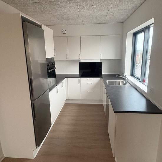 The property has been recently renovated with everything that comes with it. The apartment features beautiful details, plenty of charm, a view, and is unique in its own way. Step into a large entrance hall; there is a bathroom with built-in storage, a large, attractive open kitchen that flows into the living room, and two good bedrooms with built-in closets. The apartment comes with all major appliances, including a washer/dryer combo, dishwasher, and fridge/freezer. In addition, a Troldtekt ceiling, a Genvex ventilation system, and underfl...